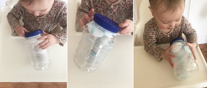 Put the plastic eggs into the jar and screw the lid on securely. Hand over the jar to your little one and let them shake it around to see the paint coat the eggs! Depending on what paint you use, you may find that it isn’t covering the eggs as much as you’d like. If so, just add a tiny splash of water into the jar and that will help get the paint moving and create an almost watercolor look on the eggs. You can also add a sprinkle of glitter into the jar if you like!