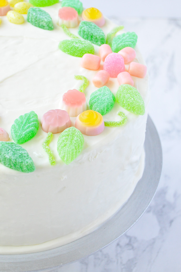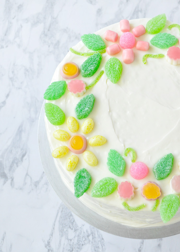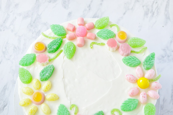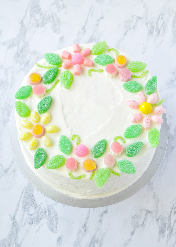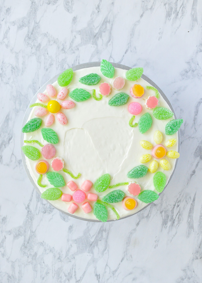 Raise your hand if you have an ever-growing collection of cute candy! When we spotted these pastel yogurt gummies at the dollar store recently, we obviously had to grab a couple bags. Today we’re turning them, and a few other candies, into this summery floral wreath cake! It is SO much fun to arrange the candies to make this sweet cake – plus, if you’ve got a batch of cupcakes you can so easily top them with matching candy flowers!