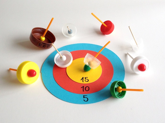Save all your lids and nozzles from the recycling bin and turn them into colorful spinning tops. But don’t stop there – craft simple boards using scrap paper to create an entire series of tiny tabletop games to keep your kids entertained for hours.
