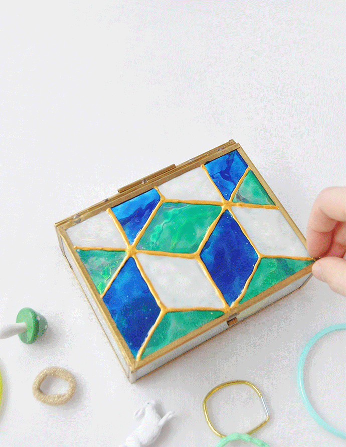 The first thing you want to do is trace your glass box onto a piece of paper and draw out your design using pencil. We went with a simple geometric pattern, and use colored pencils to test out the colors we wanted to use too. Once you’re happy with your design, tape it to the underside of the glass box lid. Use Gallery Glass Liquid Leading (we used gold metallic to match our box) to trace the outlines of your designs. Let dry for about 8 hours, until dry to the touch.