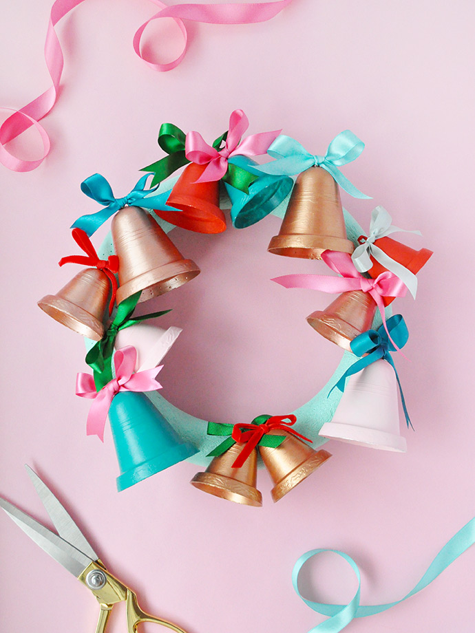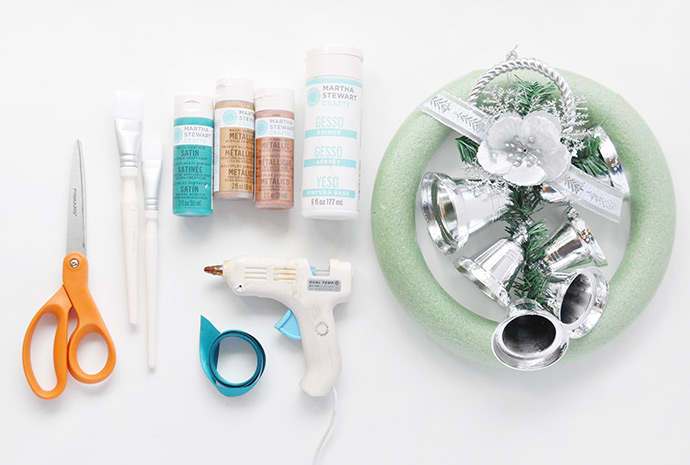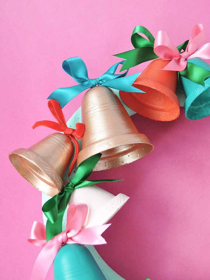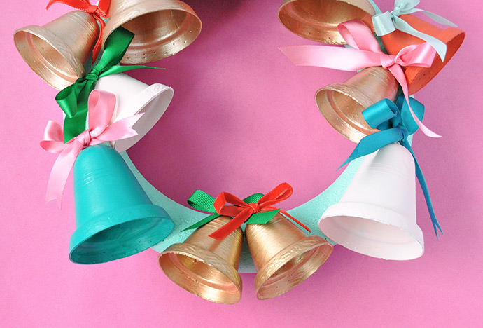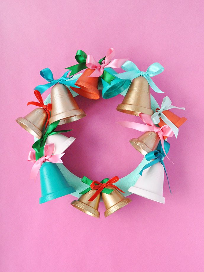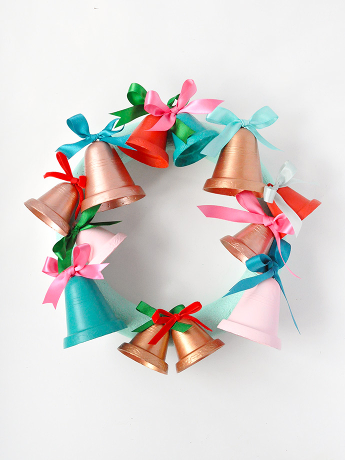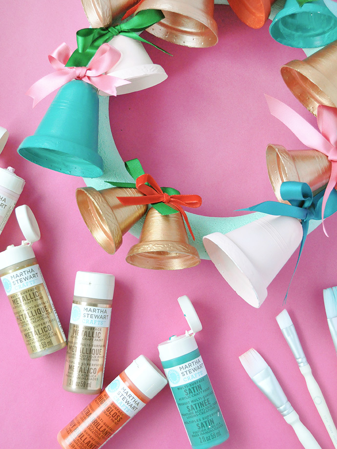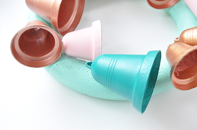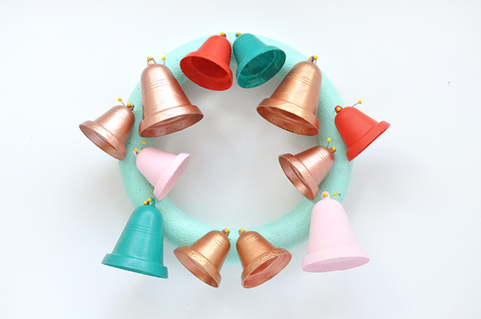 Paint the foam wreath and let dry completely. Then place the painted bells on the wreath, using pins to set up the placement until you’re happy with it.