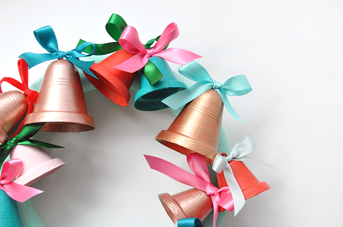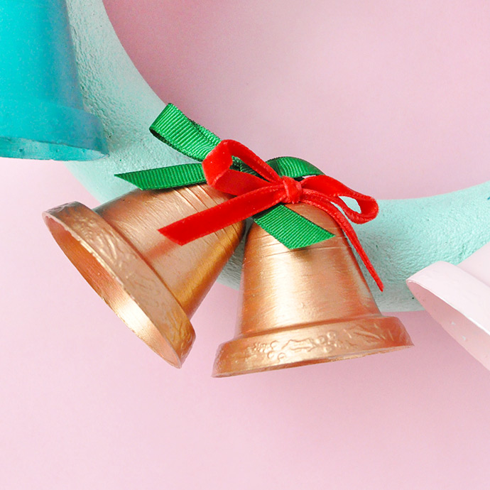 Use your hot glue gun (on the low heat setting) to attach the bells onto the wreath.