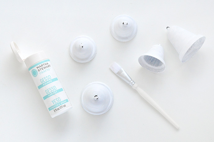 Remove the plastic bells from the garland and apply gesso primer on the inside and outside of each. Let dry.