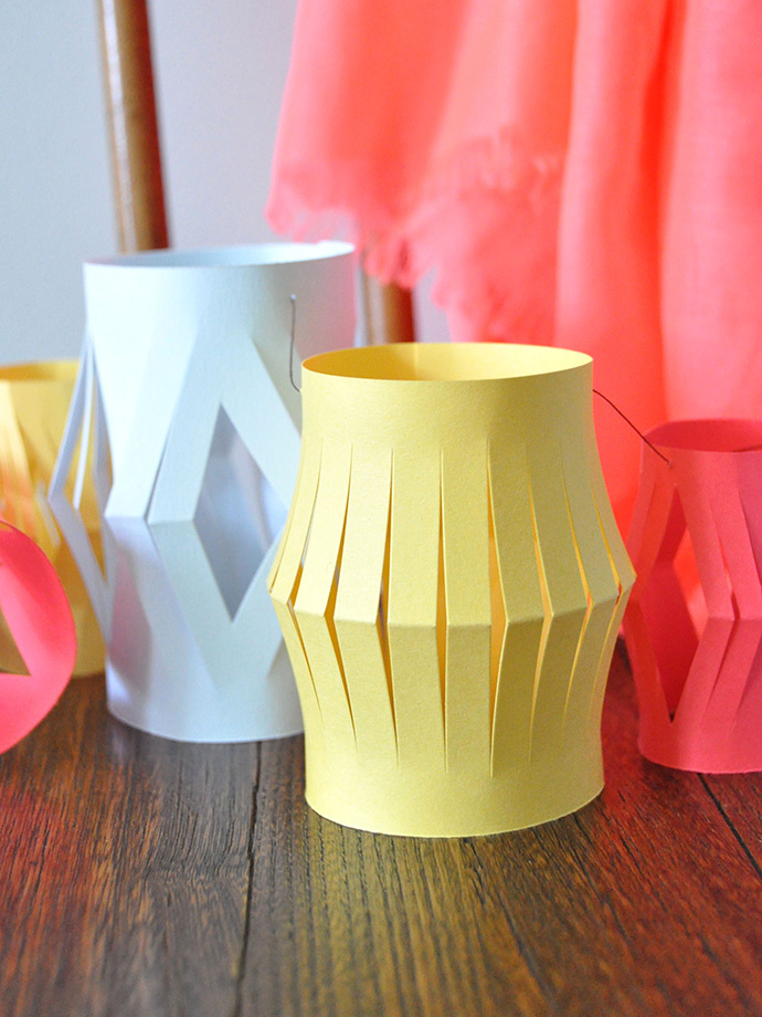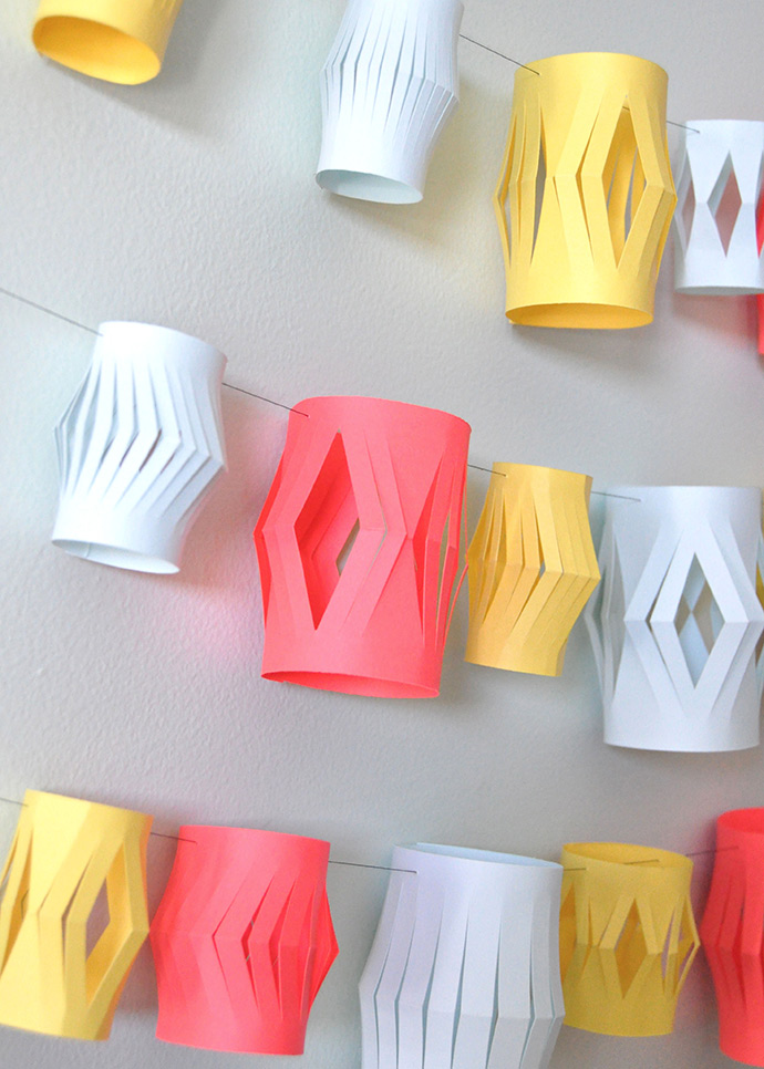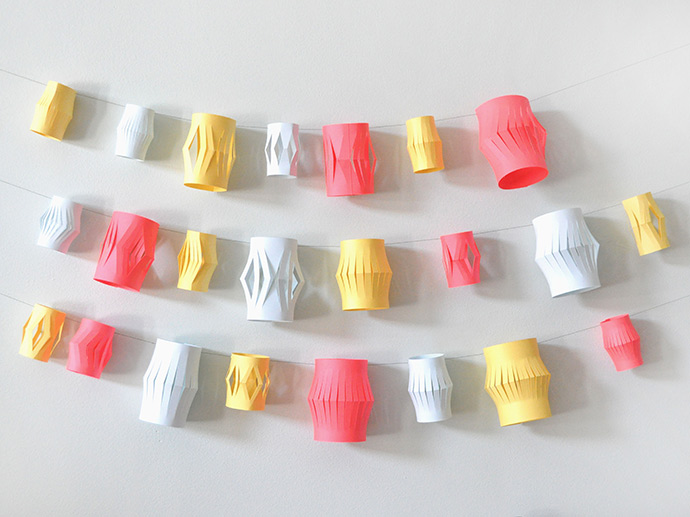 Did you ever make paper lanterns as a kid? Use brighter colours and simple shapes to make a modern and playful garland for your next party! This is an amazing way to use up those paper scraps you’ve been holding onto, or if you don’t have enough paper on hand, grab a pack from the craft store – the color-coordinated multipacks would be perfect for this! We used pale blue, medium yellow, and neon red card stock for this one, and we love how simple and modern the end result is.