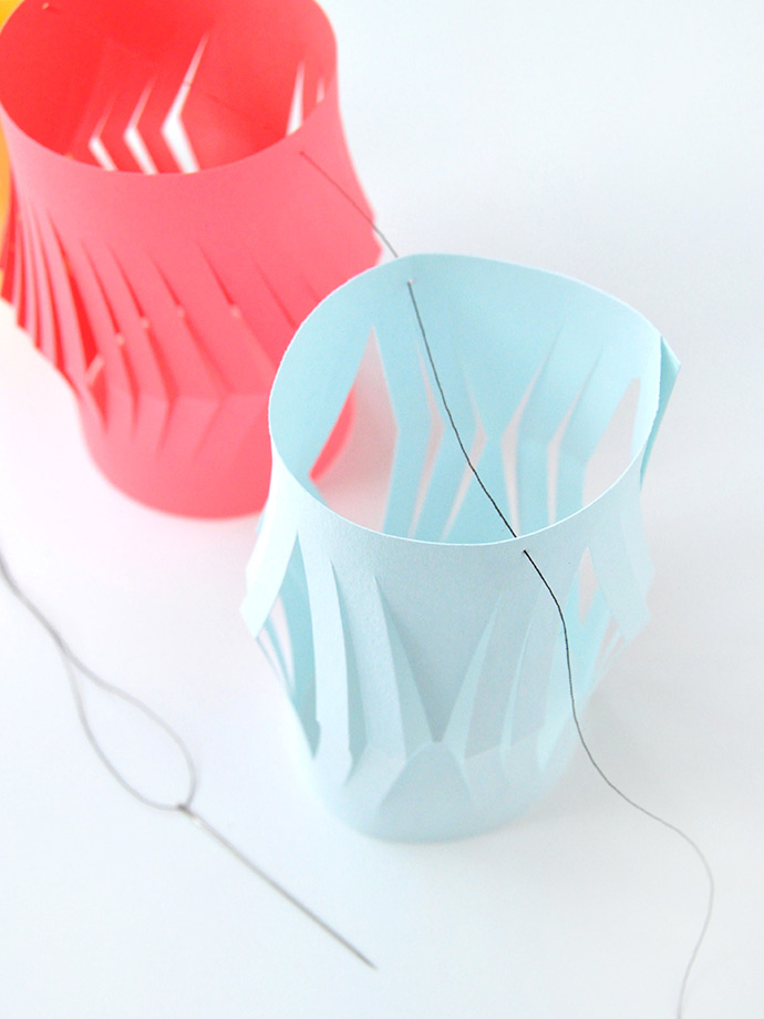 Cut a long piece of thread and thread through the needle. Use the needle to pierce holes across the tops of the lanterns to string them all together.