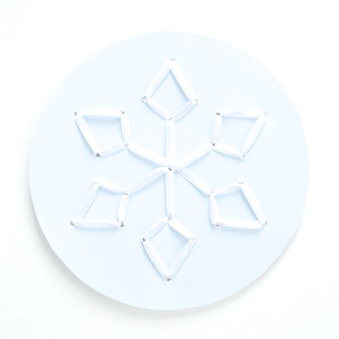 Begin stitching through the holes in the first stitching card. Follow the pre-printed lines for where to stitch and make the snowflake designs. Use straight stitches and back-stitch throughout the patterns.