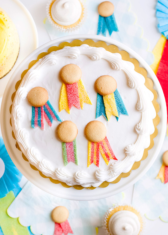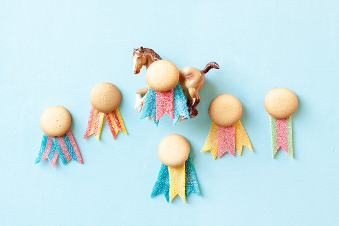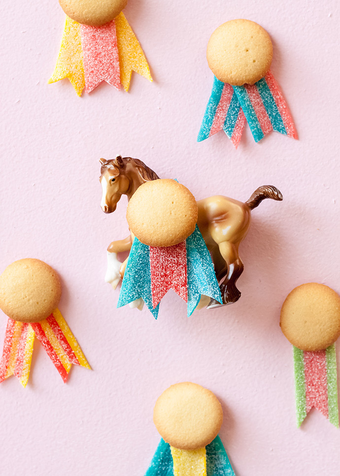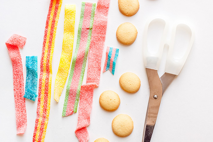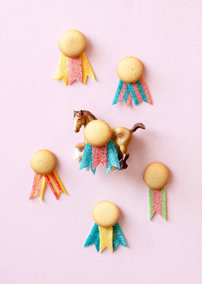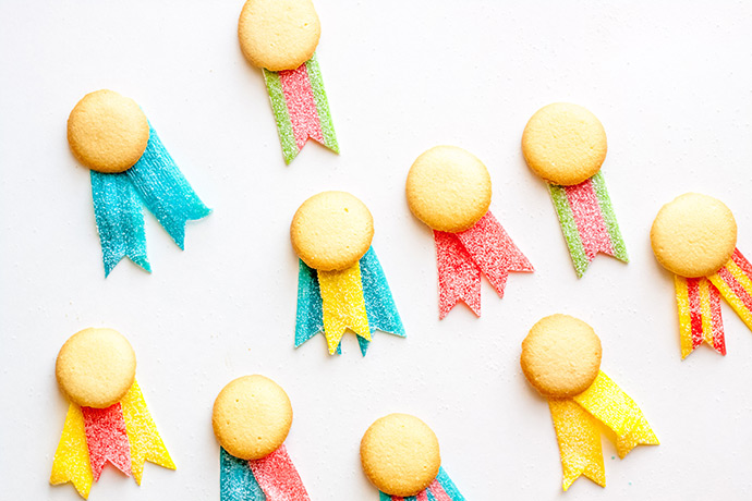 Arrange one, two, or three sour strips under a mini vanilla wafer cookie, to look like a prize ribbon. Play around with the colors and arrangement.