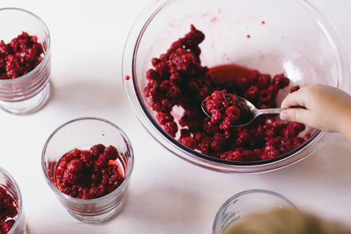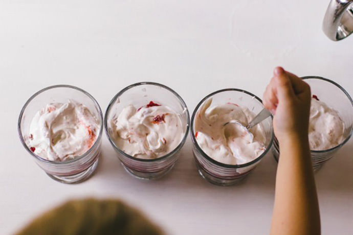 In four serving cups or bowls, place about a 1/3-1/2 cup of raspberries at the bottom. Top with 1/2 cup of whipped cream, then another 1/3-1/2 cup of raspberries. Very gently swirl the three layers together, to make some pink streaks if desired.