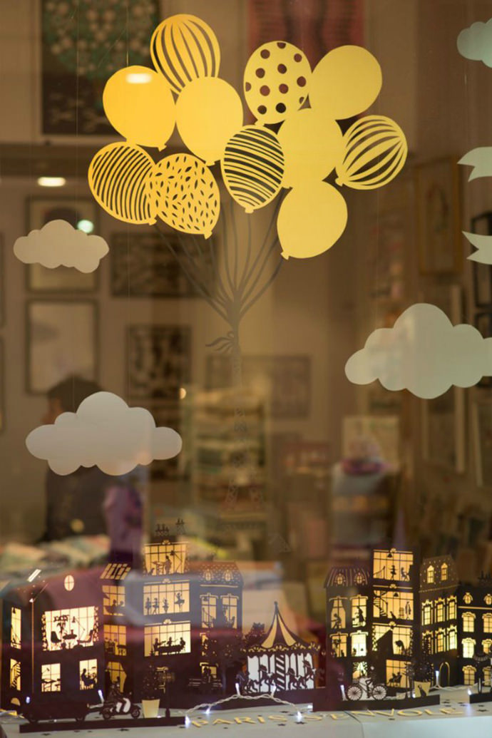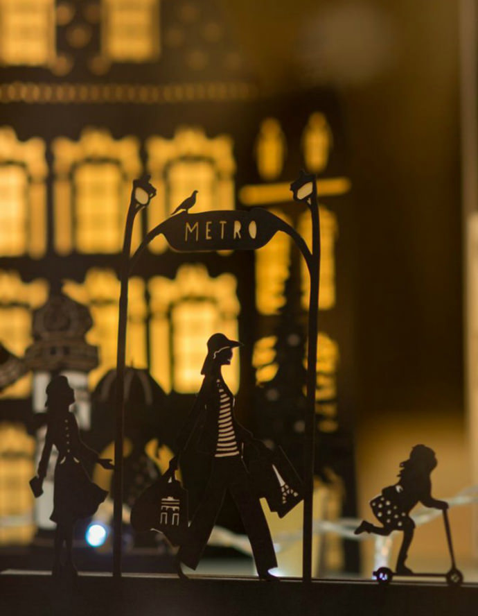 Detail of Hélène Druvert’s papercut window display for L’Illustre Boutique.