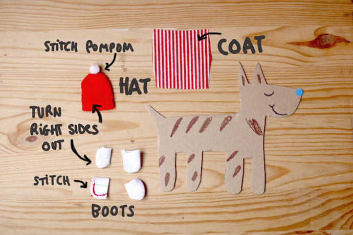 Now it’s time to dress the dog! Cut a piece of fabric for the coat. You can make the dog’s hat from felt and stitch it as you did for the gloves, using straight stitches. Add a pompom on top. Cut out 8 sock shapes (or cut 4 and fold them as shown in the above) and stitch.
