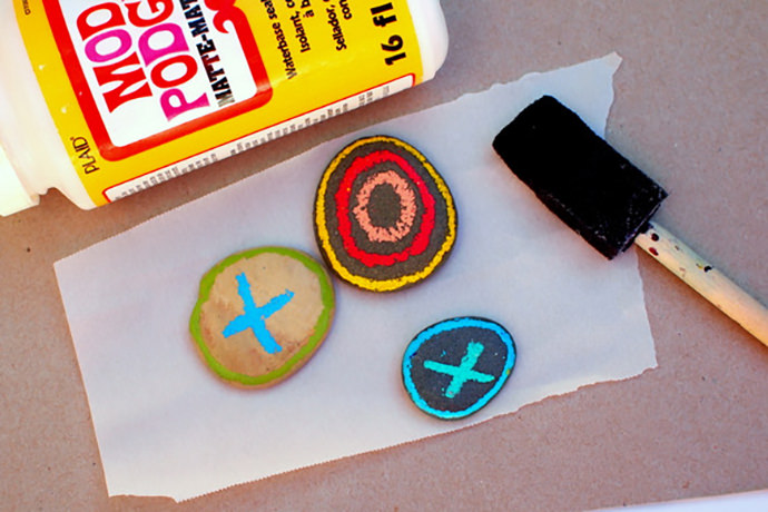 Cover your work area with parchment paper. Use your foam brush to coat the rocks with Mod Podge. This will prevent your oil pastels from smearing. (You could also do this on a piece of scrap paper, but the rocks might stick to the paper when the Mod Podge dries.)
