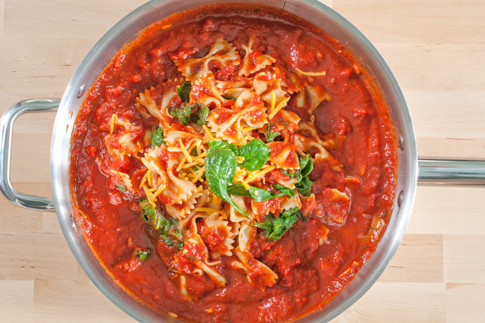 Pour everything into the pot. Soak in the beauty of a one-pot pasta dish. Give it a stir.