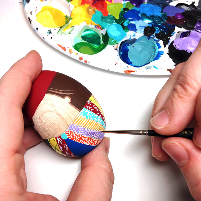 Begin by lightly sketching an outline onto the bare wooden egg. We suggest starting with the face and moving outward to clothing and hat/hair details. This will be covered by paint, so it can be a pretty rough sketch. We prefer to leave faces blank to allow for completely pretend play, but feel free to add any expressions you like!