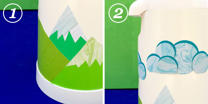 Cut out different sized triangles for the mountain scenes using a rotary cutter and metal ruler. Cut out smaller triangles of a lighter paper for the snow caps. Cut zigzags along the bottom of this smaller triangle to create a jagged effect. Begin arranging your mountains on the diaper pail. (Use washi tape to hold in place while you layout your scene.) After your mountains are aligned to your liking, begin gluing to the diaper pail with the tape runner.