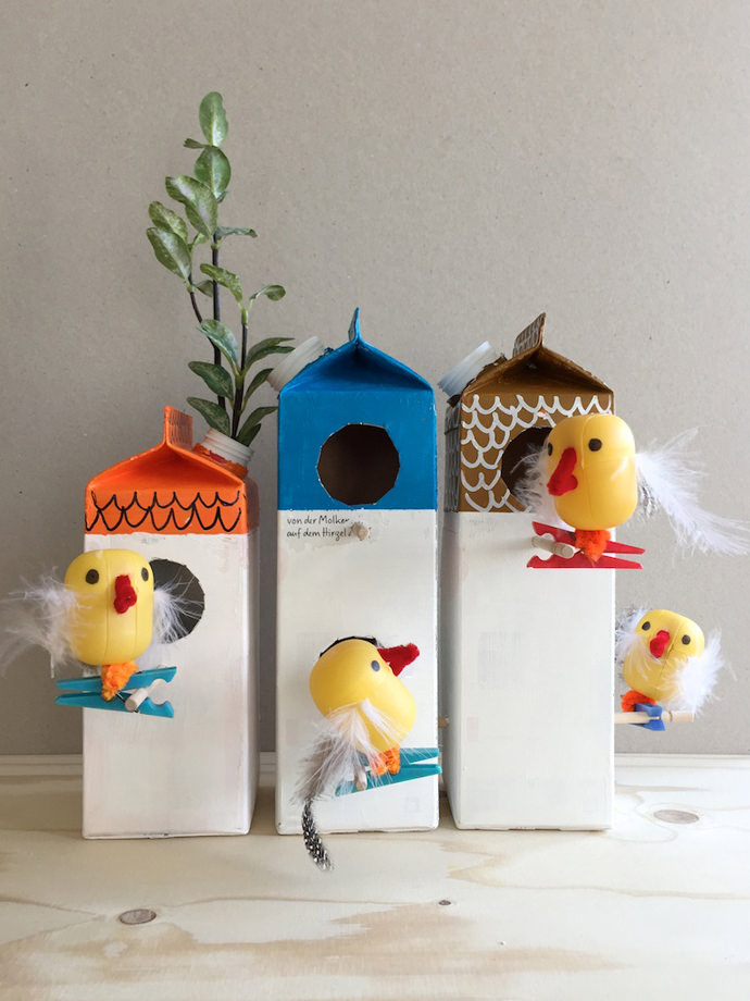 “What do I do with all the empty milk cartons and juice boxes piling up in the recycling bin? There’s got to be something crafty I can make before sending them away never to be seen again!” Sound familiar? Here’s your answer: Make a birdhouse! And funny little birdies to go in it. Watching baby birds flutter around my yard and perch on the windowsill is one of my favorite springtime activities. This is the perfect way to bring some of that magic indoors.