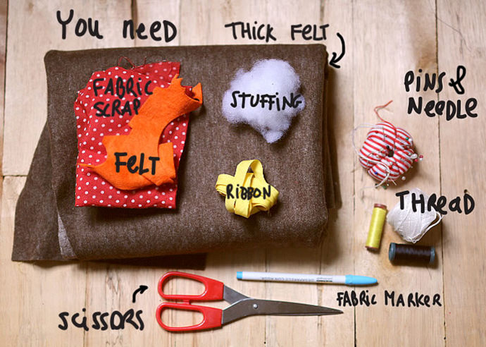 Download the pattern. Scale to 200% and print. Cut out the template shapes and using a fabric marker, trace them onto your felt and cut them out.
