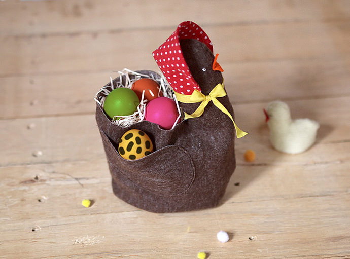 If you like hens and roosters and little baby chicks as much as I do, you’ll love this easy Easter project! All it takes is felt and fabric. It’s a cute, quick craft that doubles as a wonderful gift (and triples as an adorable tabletop Easter decoration!) Fill it with painted eggs or yummy candies, and once the holiday is over, reuse it as a place for keeping tools and crafts. Plus – who ever heard of a bunny hatching eggs?The Easter chicken is where it’s at :)
