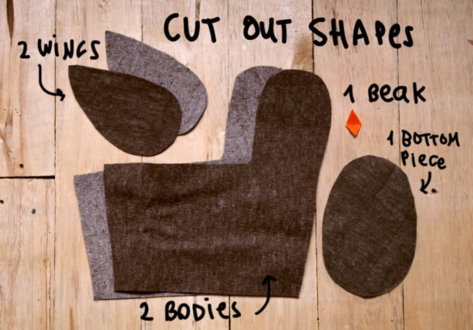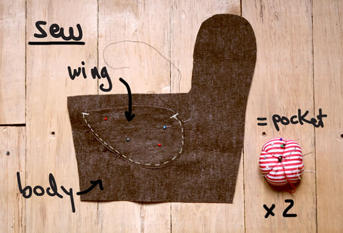 Take one wing and place it on one large body piece. Sew the curved part of the wing, leaving the top of the wing open. This will serve as a pocket. Repeat for the second body shape.