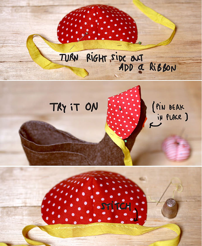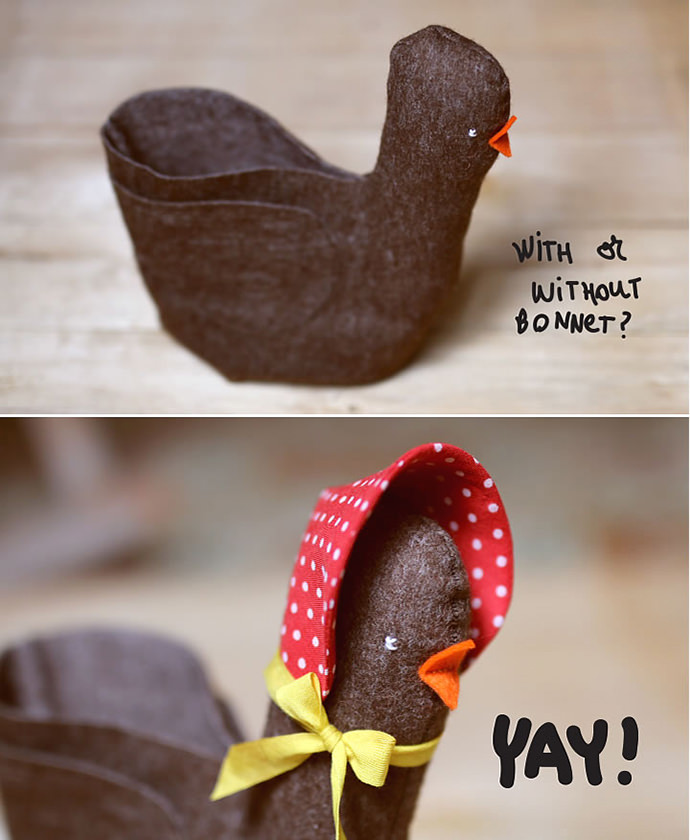 With the bonnet still right side out, pin a ribbon (about 17 inches long) to the bottom edge. Place the bonnet on the chicken’s head to adjust ribbon to the right length and stitch along the bottom.