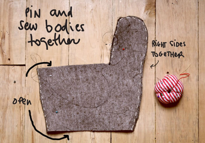Line the body shapes together so that the right sides are touching (it will look inside out to the eye) and sew the sides and all around the head, but leave the top and the bottom of the body open.
