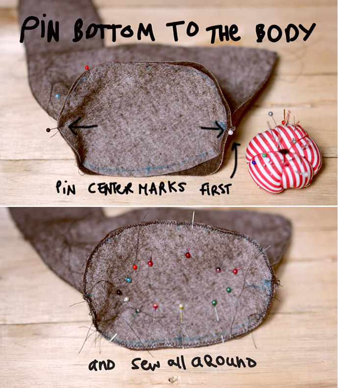 After both pieces are sewn together, lay the body flat on the table and and fit the oval shape into the bottom opening. Pin to fix the oval in place, then start marking and pinning center marks to the body seams. Pin the rest and sew all around.