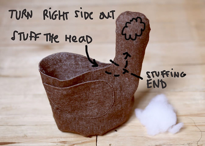 Turn the body right side out and stuff the head with polyfill (this hen’s head will remain open inside the basket, so try not to overstuff it!)