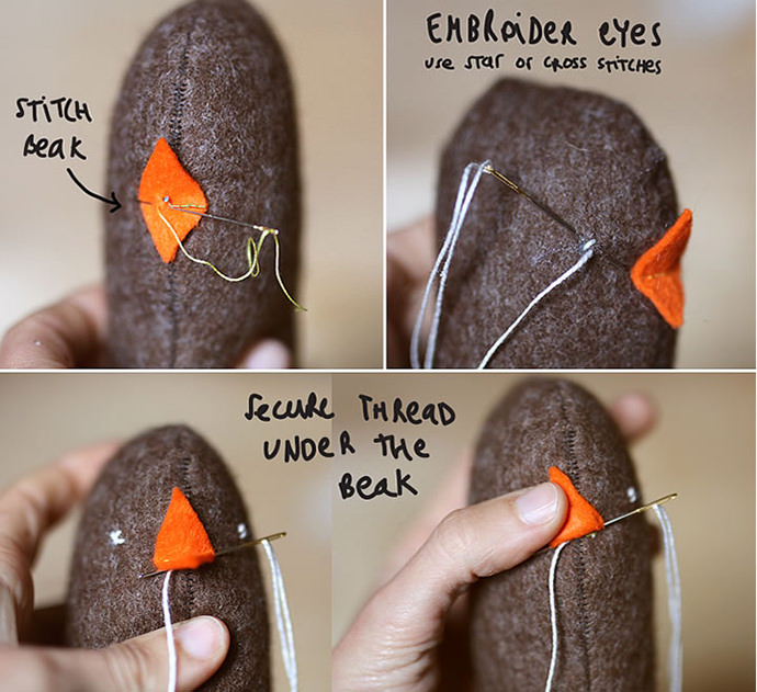 Stitch your hen’s beak using backstitches and matching sewing thread. With a contrasting thick thread, make either star or cross stitches to embroider the eyes. Secure the thread underneath the beak to keep it hidden.