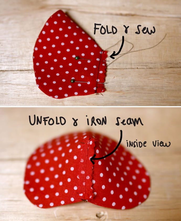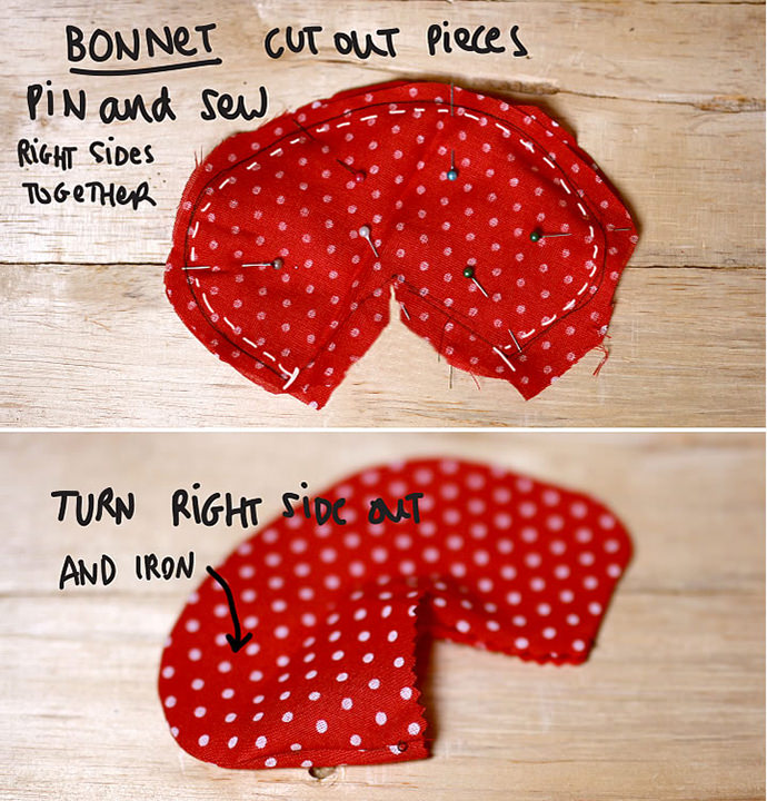 Time to give our hen a pretty little bonnet! Cut out two bonnet shapes from template and transfer onto your fabric of choice. Pin the right sides together (so that it’s inside out to the eye) and sew around the curve. Turn the bonnet right side out and iron to flatten seams.