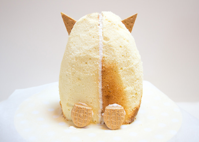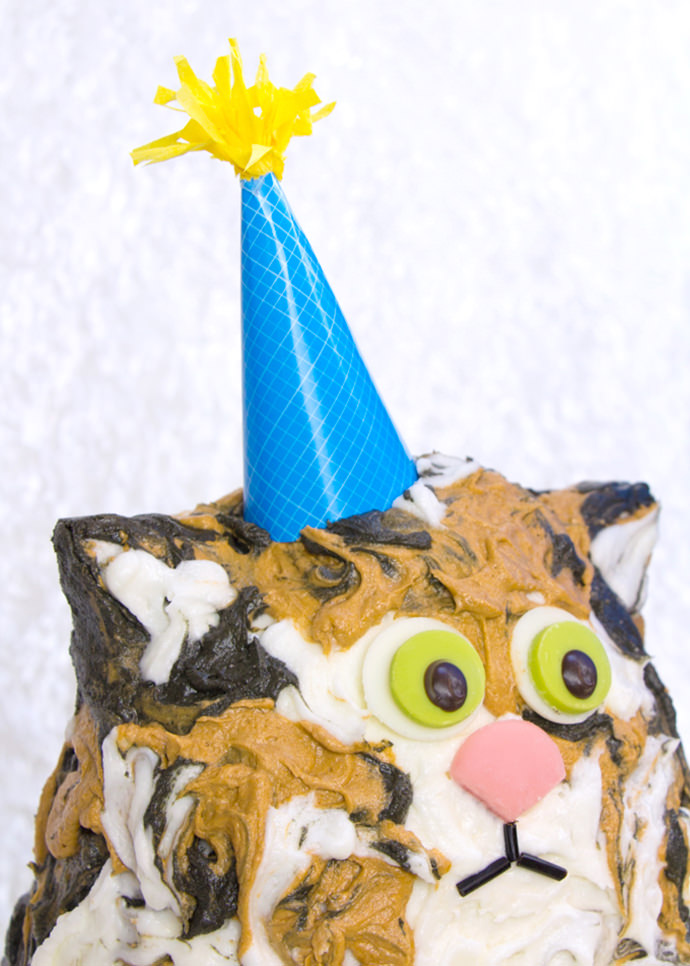 So, what do you make for a cat named Cake? Well… cake, of course. I was quite surprised at how easily this silly dessert came together. Just sandwich together two simple pound cakes, do a little carving, then swirl on some calico-colored buttercream icing.