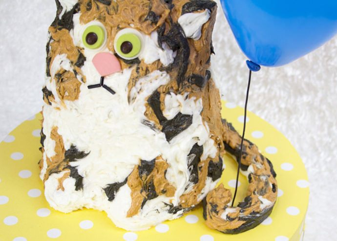 Gently slide the parchment paper out from under the cake, positioning the cat on the hat box with enough room to make the tail. Pipe the cat’s tail with the remaining frosting. Poke a hole in the hat box and insert the balloon attached to a thin metal wire. The foam inside the hat box should help keep it upright and in place.