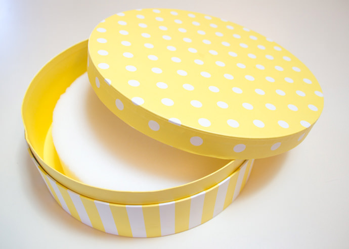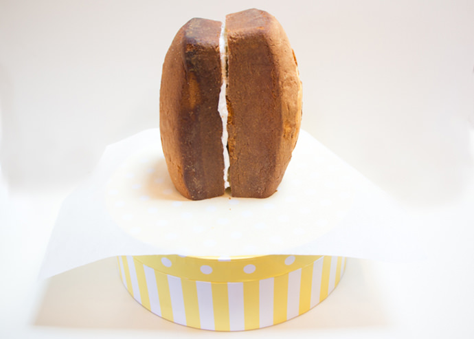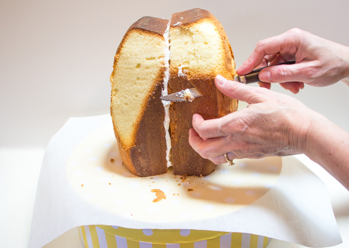 Cover the top of the hat box with a sheet of parchment paper to keep it clean while you shape and frost your cake. Trim the sides and bottoms of the pound cakes and frost them together, upright.