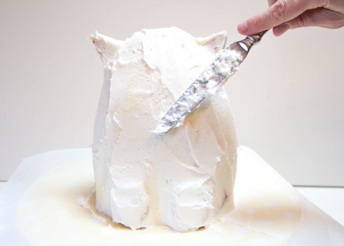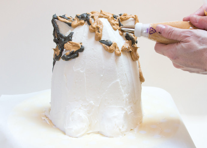 Pipe around the calico spots with more white frosting – blending and swirling all over the cake.