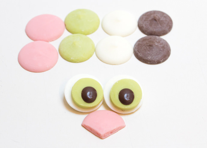 Make the eyes and nose with candy melt wafers. Use frosting to stick the shapes together. Add the eyes and nose to the cake.