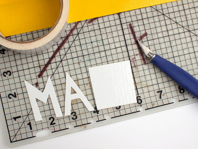 To cut out your letters and shapes, pull off a piece of duct tape and stick it to your cutting mat. Use a craft knife to trim the tape and cut out your letters.