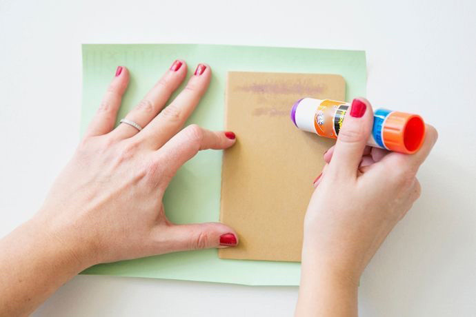 Apply glue to the front of the notebook and press the glued side onto the left half of the paper. Flip the notebook over and smooth out the paper. Then, apply glue to the spine and back of the notebook. Adhere the paper to these sides by smoothing the paper down at the spine first and then smoothing down the back.