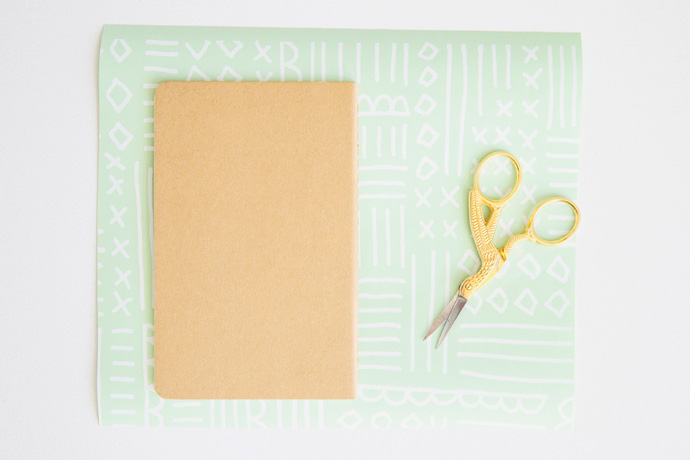 Cut the decorative paper so that it is slightly more than twice the size of your notebook. I found it helpful to wrap the paper around the notebook to test the size before making my final cuts. You’ll want about an inch of margin around the sides for wrapping the edges at the end.