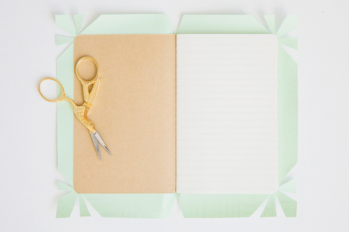 To finish your notebook, one option is to cut the paper around the edge. Another option is to wrap the edge, which will make the cover extra durable. To wrap the edge, cut vented slits in the decorative paper at the spine and at the corners. Then glue. If your notebook happens to have rounded corners like mine does, cut multiple vents at the corner to achieve a curved wrap.