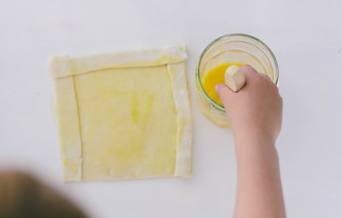 Lightly flour your work surface, and gently roll out the puff pastry into a 9-inch square. Using a pizza wheel or knife, cut the puff pastry into 4 equal squares. Cut ½-inch strips from each side of the squares and set aside (you will have four strips total for each piece). Transfer the squares to a parchment lined sheet pan.