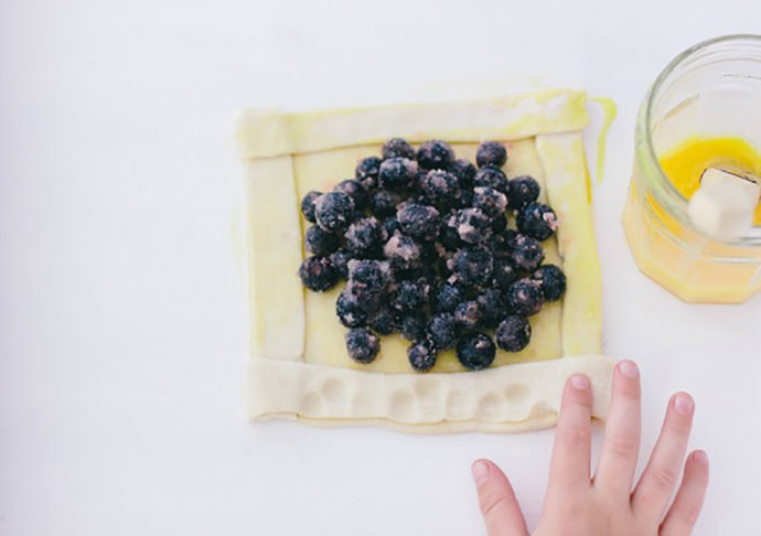 Take the puff pastry out of the fridge. Divide the sugar-coated blueberries equally between the four squares (leave behind any juice the blueberries release). Sprinkle each square with a little more sugar.