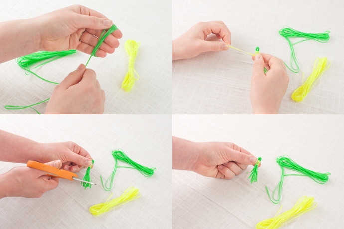 Measure your string and cut at desired length for the necklace. To create the tassel, wrap the string around your fingers several times and cut once you’ve achieved your desired thickness. Maintaining the overall shape of the loop, take string of the same color (or a coordinating one) and tie it around one end, leaving enough of the loop exposed to thread your necklace string through. Once you’ve wrapped your coordinating string around several times and secured it, clip the other end of the loop to free the tassel.
