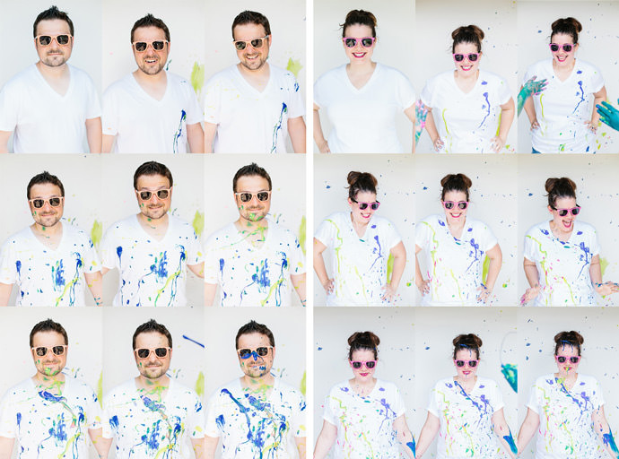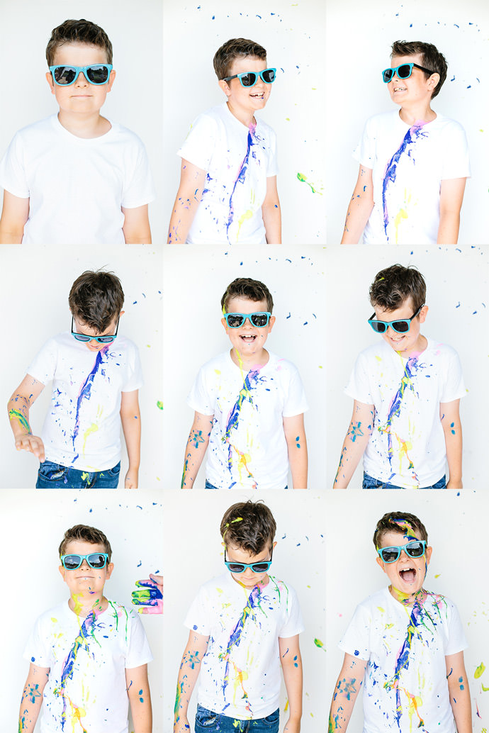 Take a portrait of each family member without paint on them while the background is still white. Make sure your subjects are wearing sunglasses or safety googles to protect their eyes. Then, go for it! Let all the little people in your life grab a hand full of paint and throw it at each other one at a time. We tried flicking paint brushes but found it was much more effective (and fun) to just let them use their hands and throw the paint.