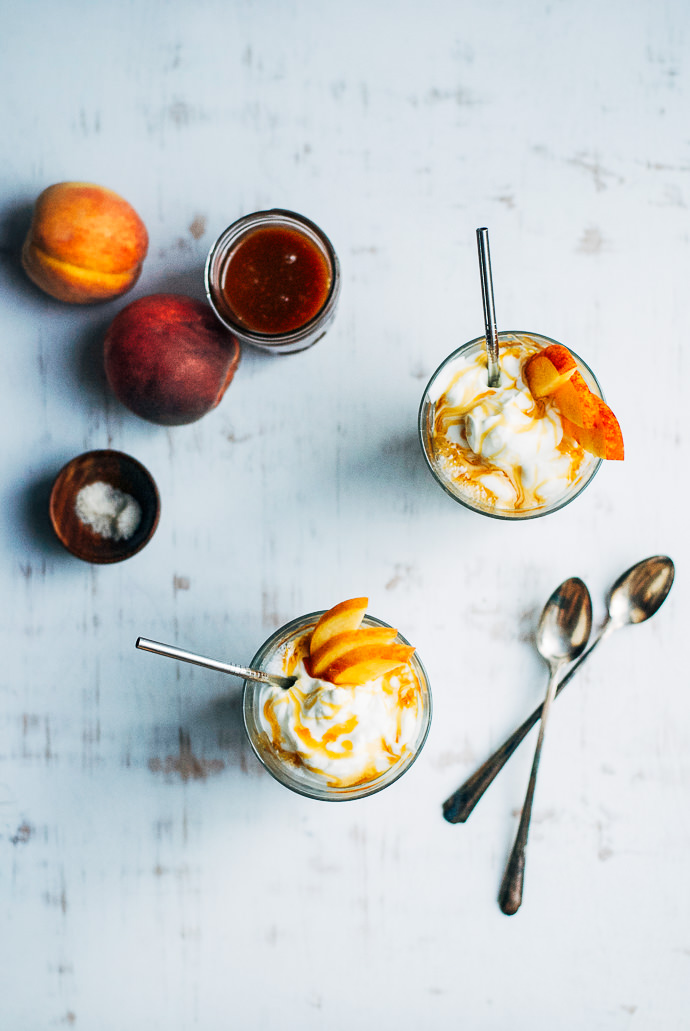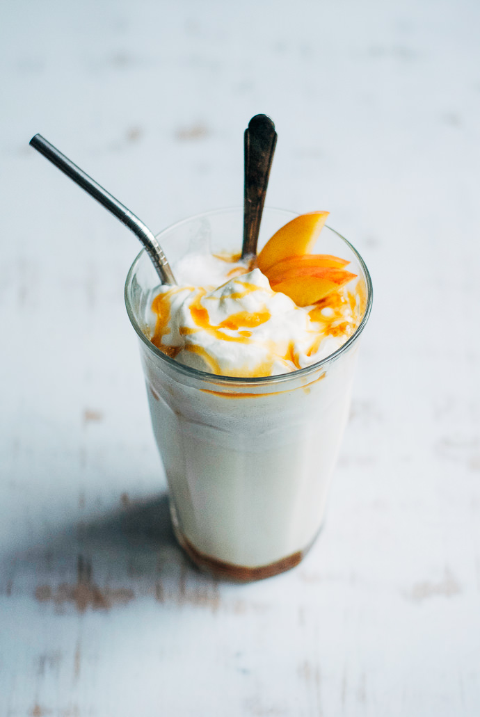 Pour into glasses. Drizzle milkshakes with warm caramel and a pinch of sea salt. Top each with whipped cream and sliced peaches, and finish with one more drizzle of caramel and a few flecks of sea salt.