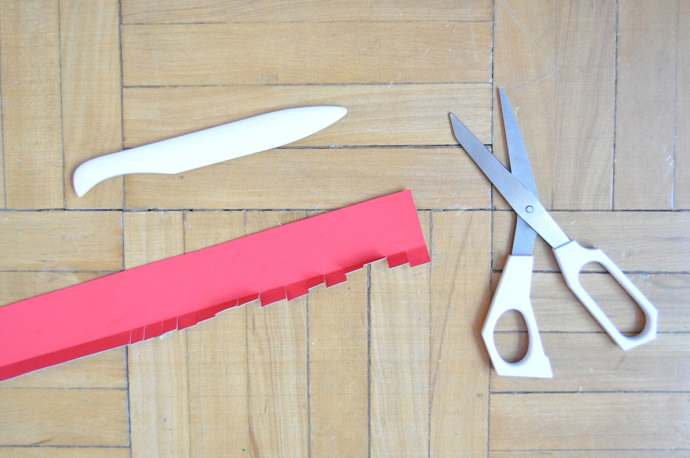 Cut out 2″ wide strips of red bristol board. Use a ruler and a bone folder to make a line 1/2″ away from one edge. Fold this over and cut snips on the 1/2″ side approximately 1/2″ apart.