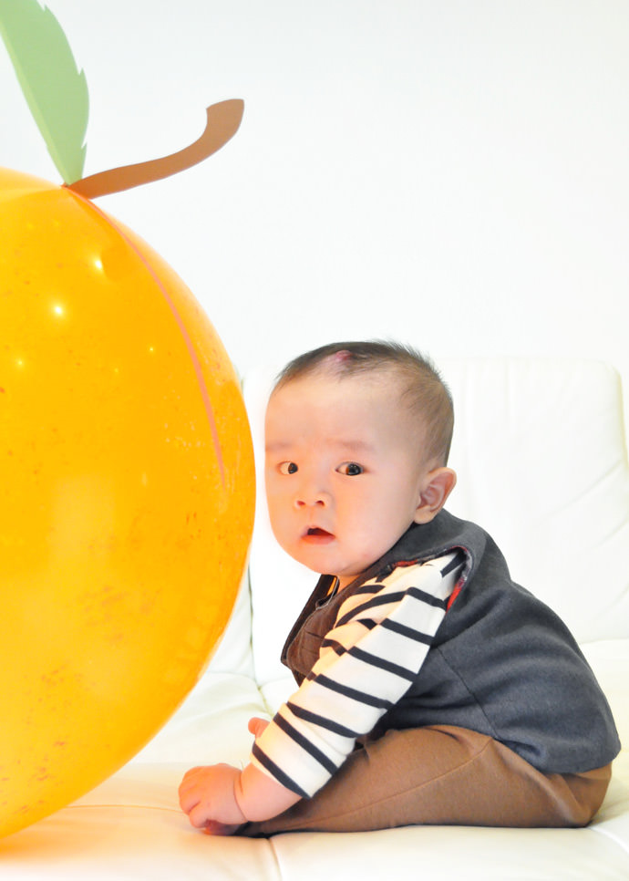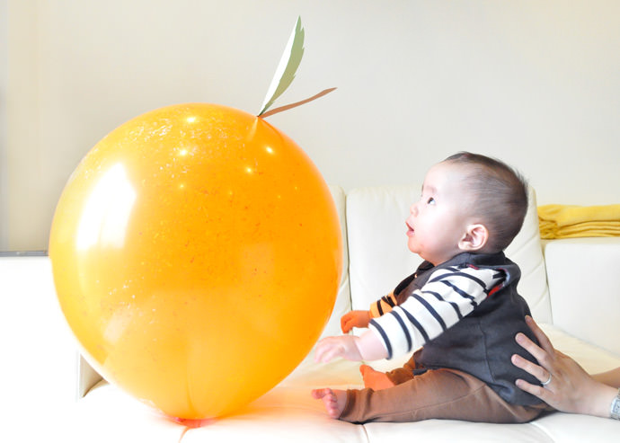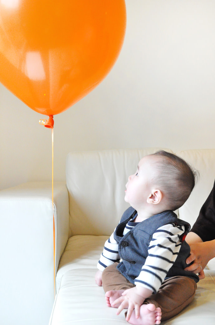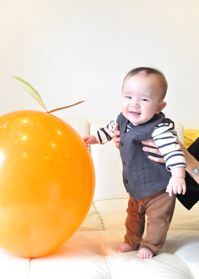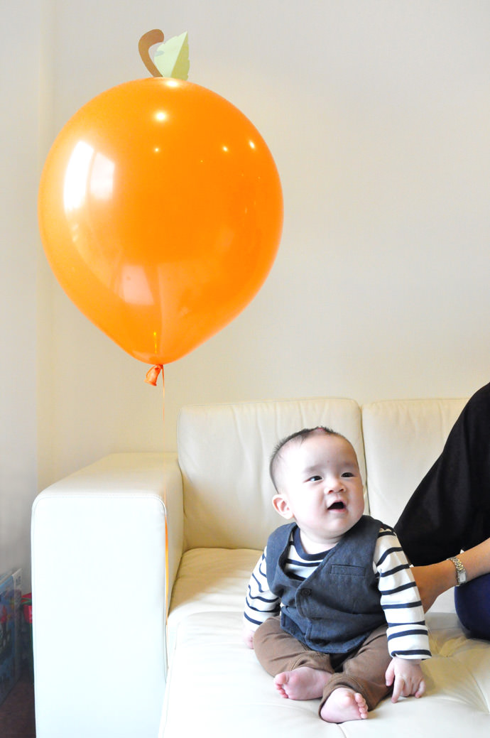 We put our little James in a cute vest over a neutral onesie and pants as a nod to the Disney adaptation of the book. Isn’t he the cutest? If you’ll be out and about this Halloween, fill your giant peach with helium and carry it around with you. Or if you’ll be sticking around the house, just blow the balloon up with regular air and let the peach bounce around your house with James. :)