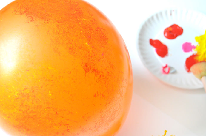 Use red, yellow, pink, and white paint to apply a splotchy spatter onto the balloon to make it look more like a peach. It helps to try this on an extra balloon or scrap paper first to test your technique. I ended up using a crumpled up plastic bag to get the look I liked.