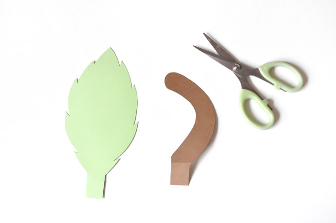 Cut a peach stem out of brown cardstock and a leaf out of green cardstock, leaving a 1” tab on the end (to tape onto the balloon later).