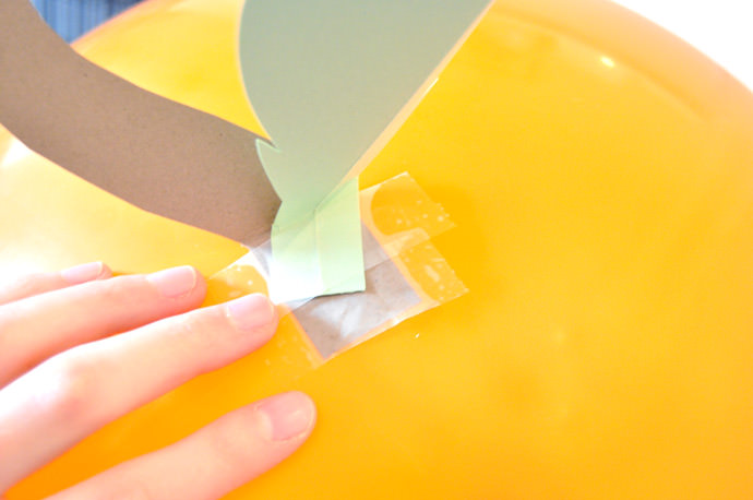 Inflate your giant orange balloon. Fold the tabs on the stem and leaf (we also creased the leaf in half) and then tape onto the top of the balloon.