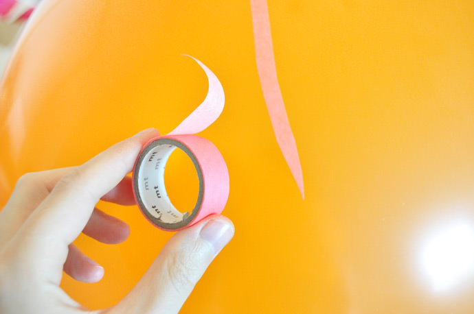 Apply a piece of pink washi tape starting at the stem and going about halfway down the front of the balloon to imitate a peach’s dimple. I used scissors to cut the ends into points for a more natural look.