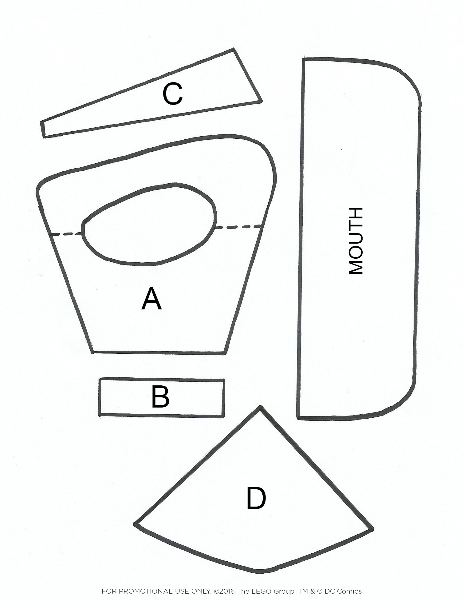 - Trace piece C onto cardboard and cut two. Then tape them to the top of the eye panels, forming brows.
