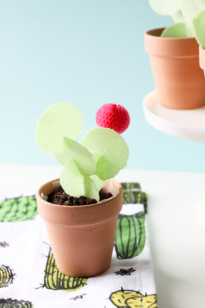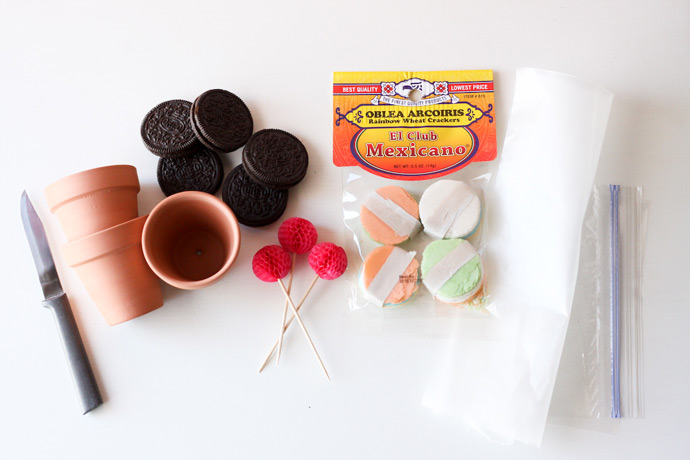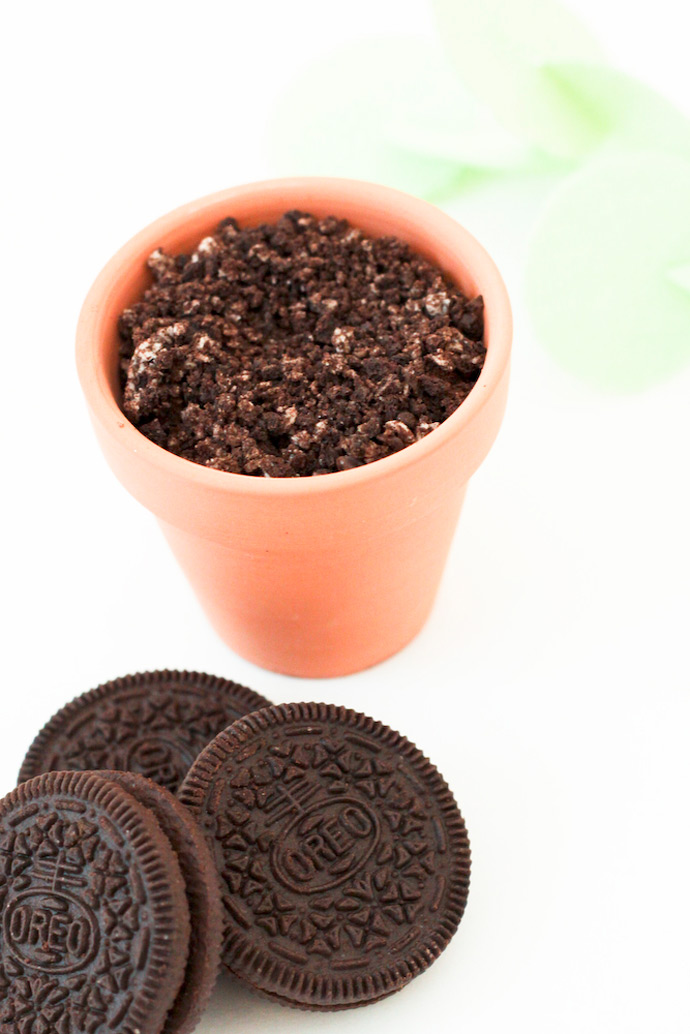 Place 3-4 Oreo cookies in a food chopper or plastic bag, and smash them until they are completely crumbled. Pour them into your mini clay pot. The white frosting ends up looking like fertilizer.
